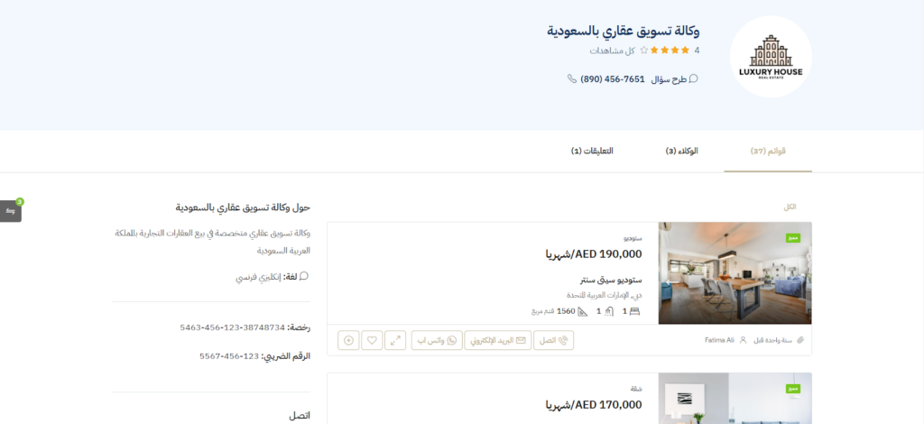 سيتم إضافة الوكالة العقارية على موقعك، وستكون الصفحة النهائية للوكالة مشابهة لما هو موضح في الصورة التالية: