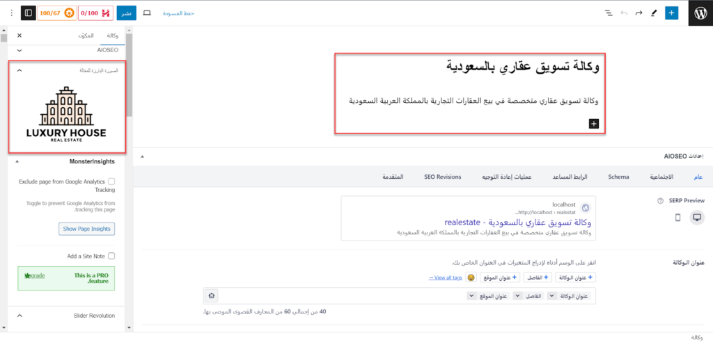 بعد ذلك، قم بتحديد اسم الوكالة التسويقية ثم قم بكتابة وصف مختصر عن خدماتها العقارية. بعد ذلك، قم بتحديد شعار الوكالة من خلال خيار الصورة البارزة كما هو موضح في الصورة التالية: