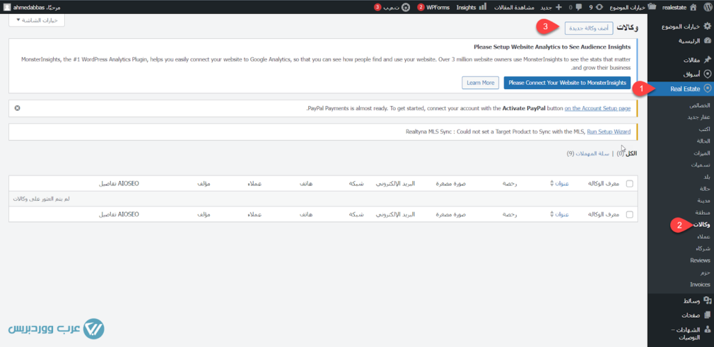 الخطوة التالية تشمل إضافة صفحات شخصية للوكالات أو الوكلاء العقاريين، حيث يمكنهم عرض الوحدات العقارية التي يُعلنون عنها على الموقع في صفحتهم الشخصية. للقيام بذلك، اختر "Real Estate" من القائمة الجانبية في لوحة تحكم ووردبريس، ثم اختر "الوكالات"، ومن ثم "أضف وكالة جديدة".