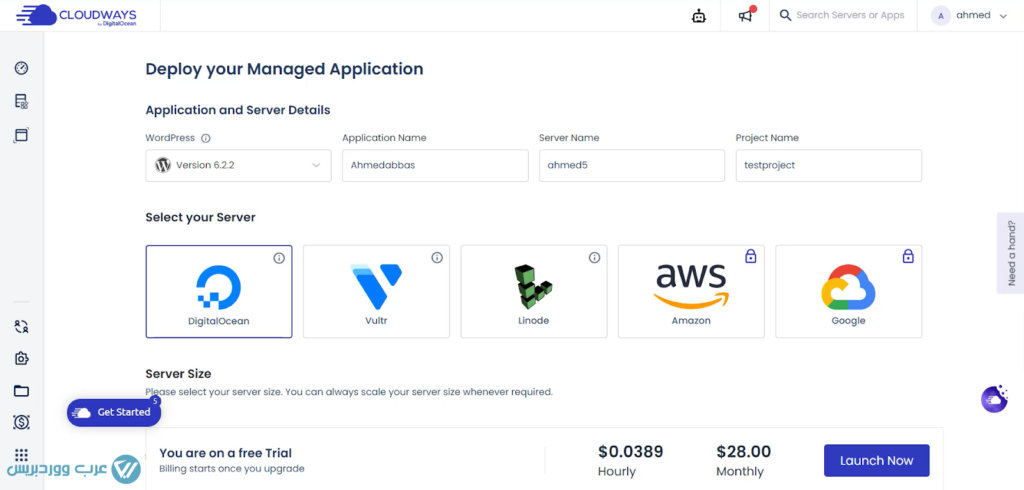 الخطوة التالية تتطلب تثبيت نظام ووردبريس على موقعك. وستجد أن أغلب شركات الاستضافة توفر إمكانية تثبيت نظام ووردبريس على موقعك بنقرة واحدة. على سبيل المثال، في استضافة Cloudways، تحتاج فقط إلى تحديد نظام تشغيل الموقع نظام WordPress وتقوم بتحديد أحدث إصدار منه، وسيتم تثبيت الووردبريس على موقعك تلقائيًا.