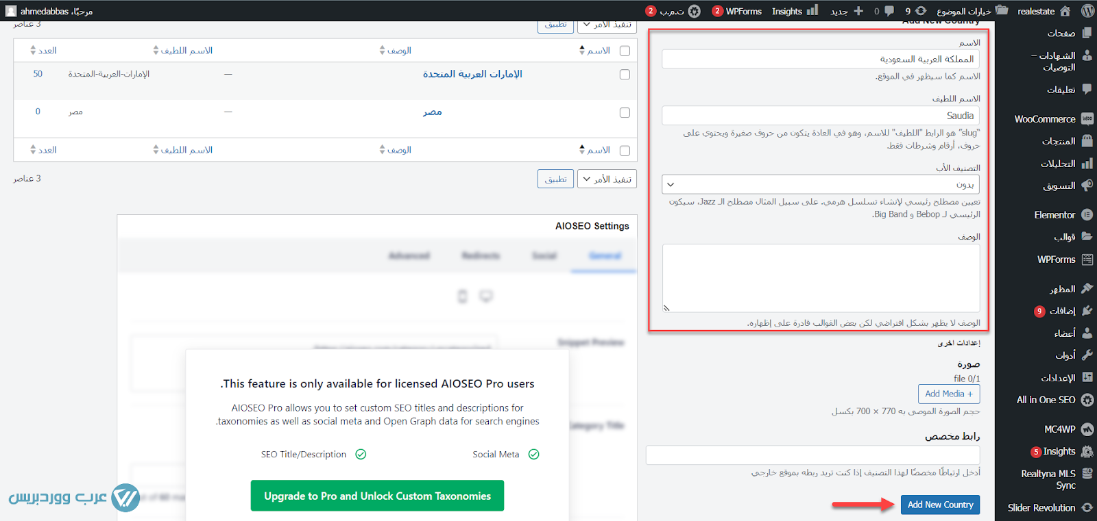 بعد ذلك، انتقل إلى خيار "بلد" وقم باضافة البُلْدَان التي تستهدفها على سبيل المثال المملكة العربية السعودية ثم أضغط على "Add New Country"، ويمكنك إضافة أكثر من دولة بما يتناسب مع استهداف موقعك.