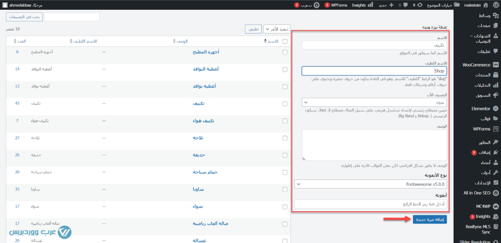 بعد ذلك، انتقل إلى خيار "ميزة" وأضف المميزات العقارية بهدف تنظيم معلومات إدخال العقار على الموقع. وسوف يتم تفعيل خاصية المقارنة بين العقارات باعتمادها، على سبيل المثال: تكييف، حمام سباحة، حديقة، جراج، وغيرها. فقم بإدخال تفاصيل مميزات العقارات كما فعلنا في الخطوة السابقة، ثم أضغط على "إضافة ميزة جديدة".