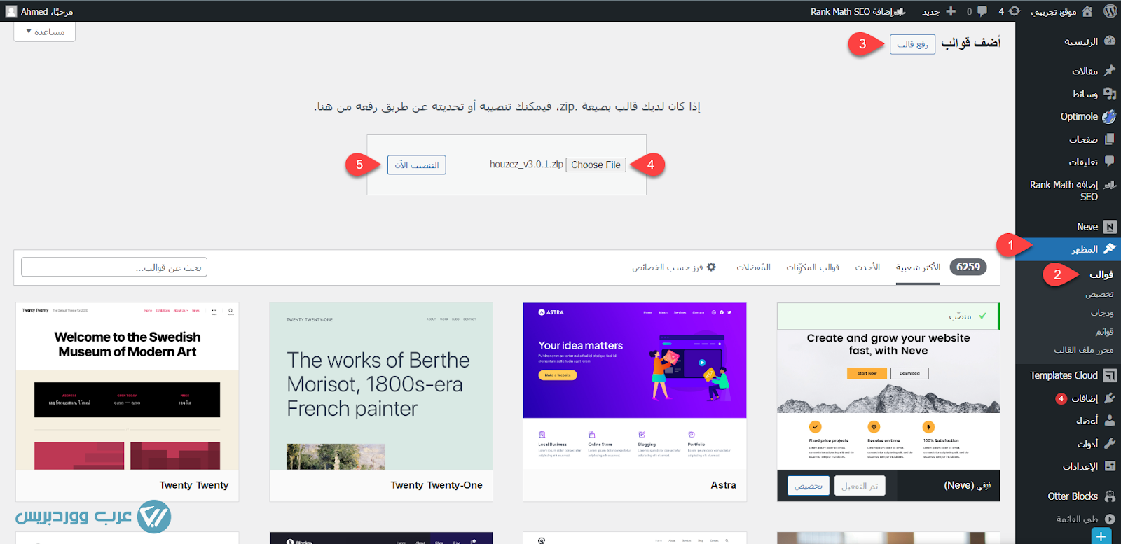 بعد ذلك، قم بالدخول إلى لوحة تحكم ووردبريس الرئيسية، واختر "المظهر" من القائمة الجانبية. ثم حدد "قوالب" من القائمة الفرعية، من ثم أضغط على "رفع قالب". بعد ذلك، قم بتحديد ملف قالب Houzez على جهازم بعد التحميل، وأخيرًا اضغط على "التنصيب الآن" كما هو موضح في الصورة التالية: