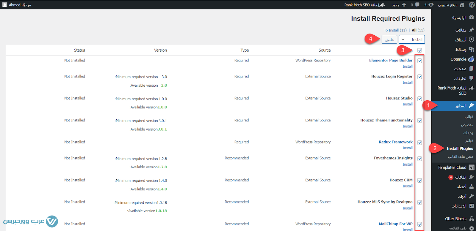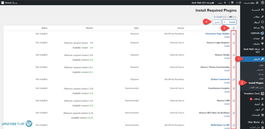 بعد ذلك، انتقل إلى خيار "Install Plugins" من قائمة المظهر أيضًا، وقم بتحديد جميع الإضافات التي يتطلبها القالب. بعد ذلك، قم بتطبيق أمر "Install" كما هو موضح في الصورة التالية: