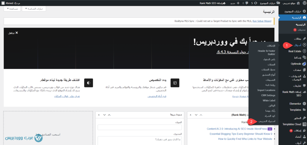 بعد ذلك، قم بتفعيل الإضافات على الموقع. ثم، انتقل إلى خيار "الأسواق" من قائمة ووردبريس الجانبية، ومنها اختر "استيراد التجريبي" للبدء في استيراد نموذج جاهز من القالب.