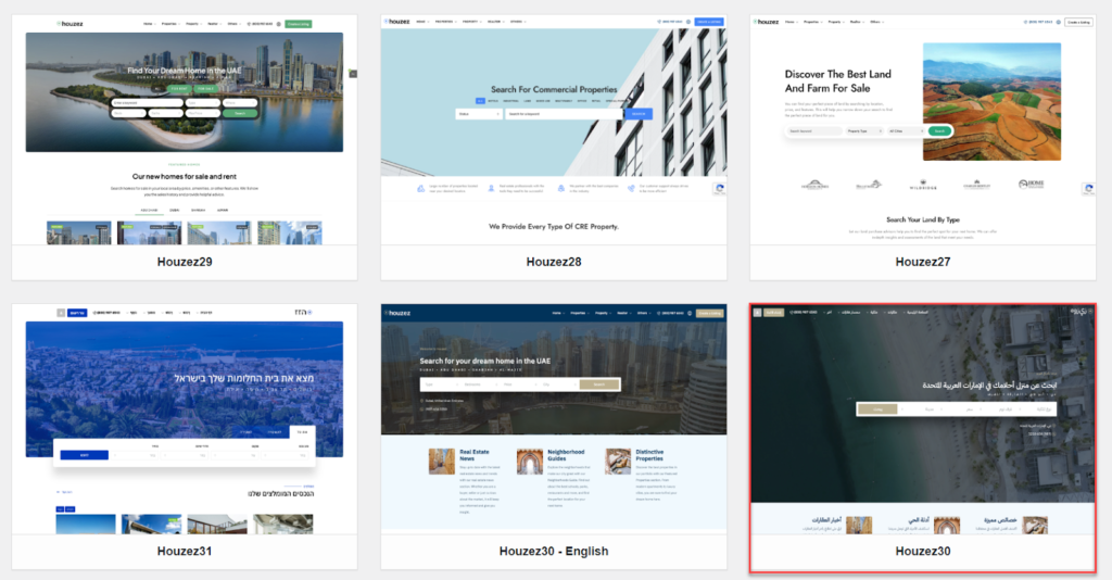 ستجد جميع نماذج قالب Houzez. يُفضل اختيار النموذج الذي يتناسب مع هوية علامتك التجارية ويتقارب مع التصميم المتوقع. من الأفضل الاعتماد على النماذج العربية حتى تكون التعديلات أقل وأبسط. على سبيل المثال، سأعتمد على نموذج "Houzez 30".