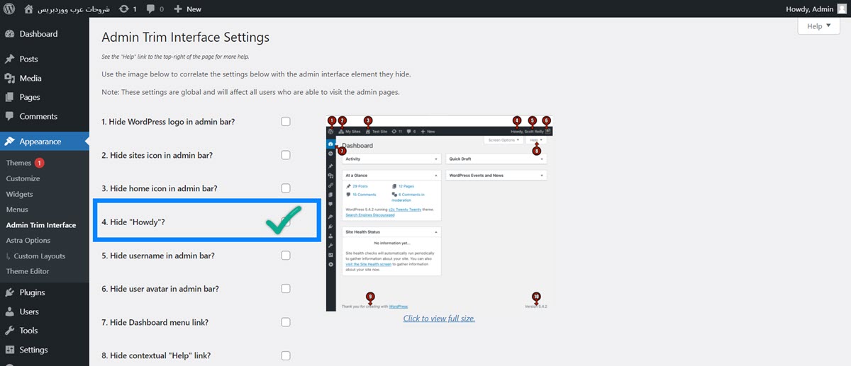 تحتاج إلى تثبيت وتفعيل مكون إضافي مثل Admin Trim Interface، وذلك لأنه يتيح لك إزالة بعض العناصر والميزات التي لا تحتاجها من منطقة إدارة WordPress، بما في ذلك تحية "Howdy".