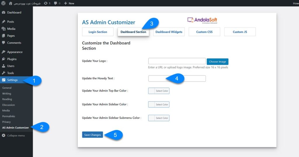 4. ستجد ضمن الإعدادات (Update the Howdy text) وهي مشار له بالرقم 4 في الصورة، في هذا المكان اكتب الكلمة التي تريد استبدال نص Howdy بها، مع العلم أنك لست بحاجة لكتابة فاصلة؛ فهي تضاف تلقائيًا.