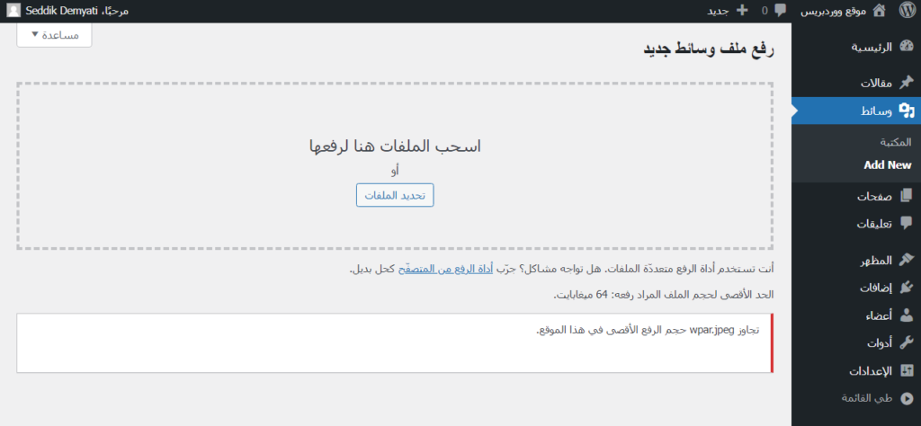 يظهر هذا الخطأ عندما تحاول رفع صورة ذات حجم أكبر من الحجم المسموح به للصور في موقعك؛ والذي يكون افتراضياً 64 ميجابايت.