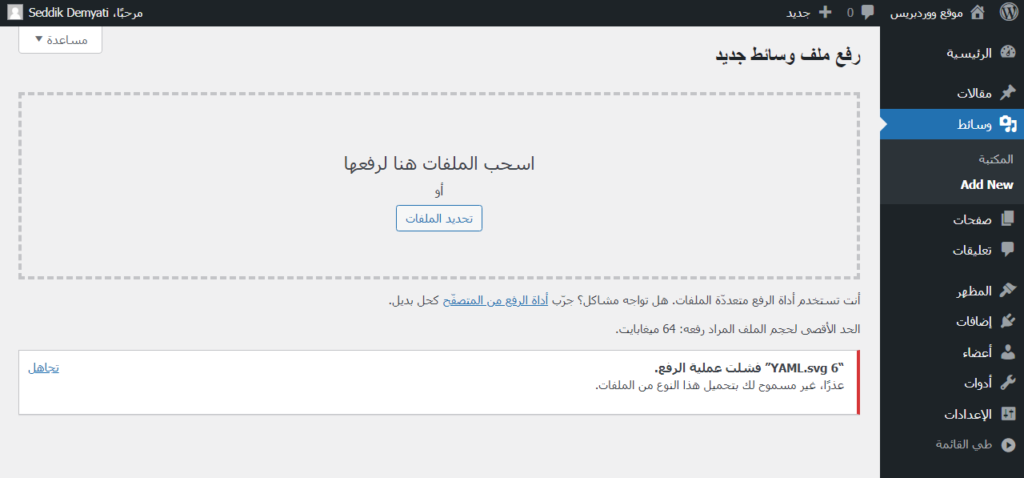 في حال حاولت رفع صورة إلى مكتبة الوسائط ولم يسمح لك برفعها، وظهرت لك رسالة الخطأ "عذرًا، غير مسموح لك بتحميل هذا النوع من الملفات."، فقد يكون صيغة هذه الصورة ممنوعة (مثل الصيغة .svg) من الرفع من قِبل نظام الووردبريس.