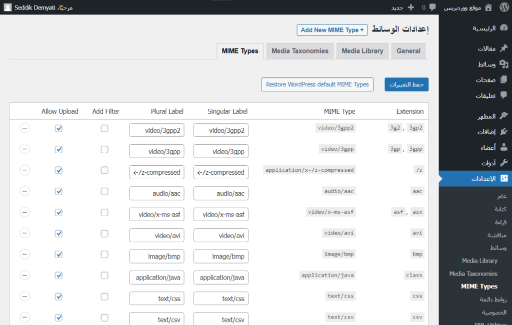 بعد تنصيب الإضافة يمكنك الانتقال في لوحة تحكم الووردبريس إلى قسم "الإعدادات"، ومن ثم "الوسائط"، ومنها إلى تبويب "MIME Types". حيث ستجد كل أنواع ملفات الوسائط (صور، فيديوهات، صوت.. إلخ) المسموح بها مدرجة في قائمة طويلة.