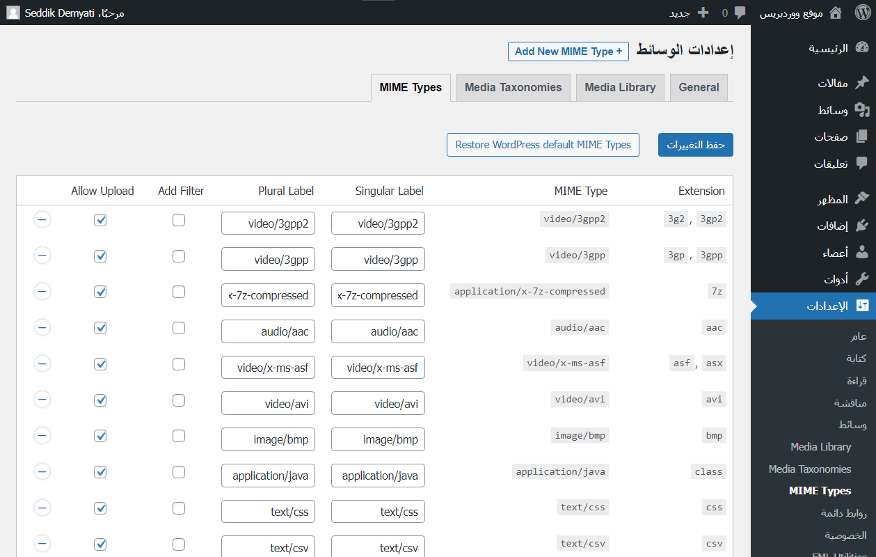 إن لم تكن صيغة الصورة التي تريد رفعها موجودة ضمن القائمة، يمكنك إضافتها عبر الضغط على زر "Add New MIME Type +"، وبعد الانتهاء من التعديلات لا تنسى حفظها عبر الضغط على زر "حفظ التغييرات".
