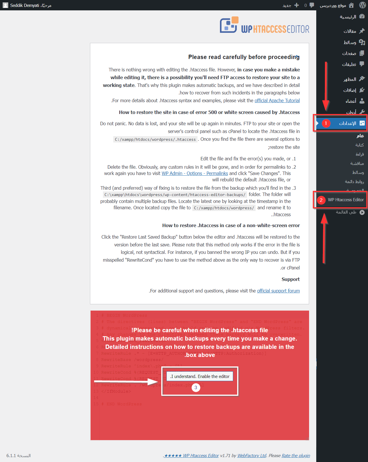 بعد تفعيل الإضافة توجه من لوحة التحكم إلى "الإعدادات"، ومن ثم "WP Htaccess Editor". حيث ستظهر لك رسالة تحذرك بضرورة الانتباه أثناء تعديل ملف .htaccess مع بعض الحلول في حال حدث خلل ما. لا تقلق، طالما لن تحذف أي شيء من الملف الأصلي فسيكون موقعك بخير.