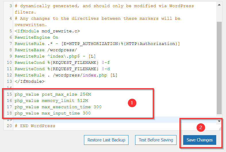 لحل هذه المشكلة، يجب بالطبع زيادة حجم هذه الذاكرة. وزيادتها تكون بإضافة السطر البرمجي التالي إلى نهاية ملف .htaccess عبر إضافة Htaccess File Editor كما شرحنا سابقاً في المقال: