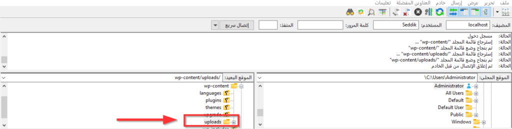 تستطيع تنفيذ نفس الحل ولكن من خلال التوجه إلى لوحة التحكم cPanel الخاصة بالاستضافة[11] ، ومنها إلى مدير الملفات File Manager، ومن ثم تحديد ملف uploads وتعديل أذوناته عبر تعديل القيمة العددية مثلما شرحنا قبل قليل.