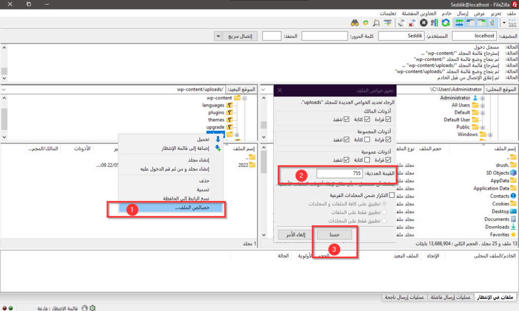 ومن القائمة التي تظهر عند الضغط على زر الفأرة الأيسر، اختر "خصائص الملف...". ومن نافذة الخصائص، نعين "القيمة العددية" إلى 755 أو 744 (جرّب القيمة الأخرى إن لم تُصلح الأولى الخطأ)، ومن ثم نضغط زر "حسنا".