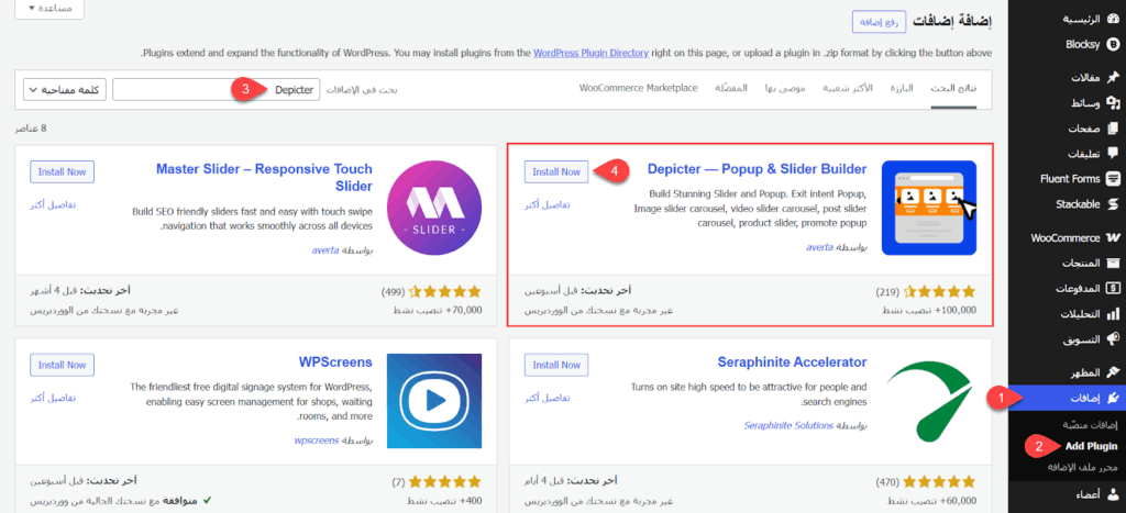 في البداية، ثبّت إضافة Depicter على موقعي من خلال التوجه إلى لوحة تحكم ووردبريس الرئيسية، ثم اختيار إضافات >> أضف إضافة جديدة من القائمة الجانبية. بعد ذلك، بحثت عن إضافة Depicter وثبّتها بالضغط على زر Install Now، كما هو موضح في الصورة التالية: