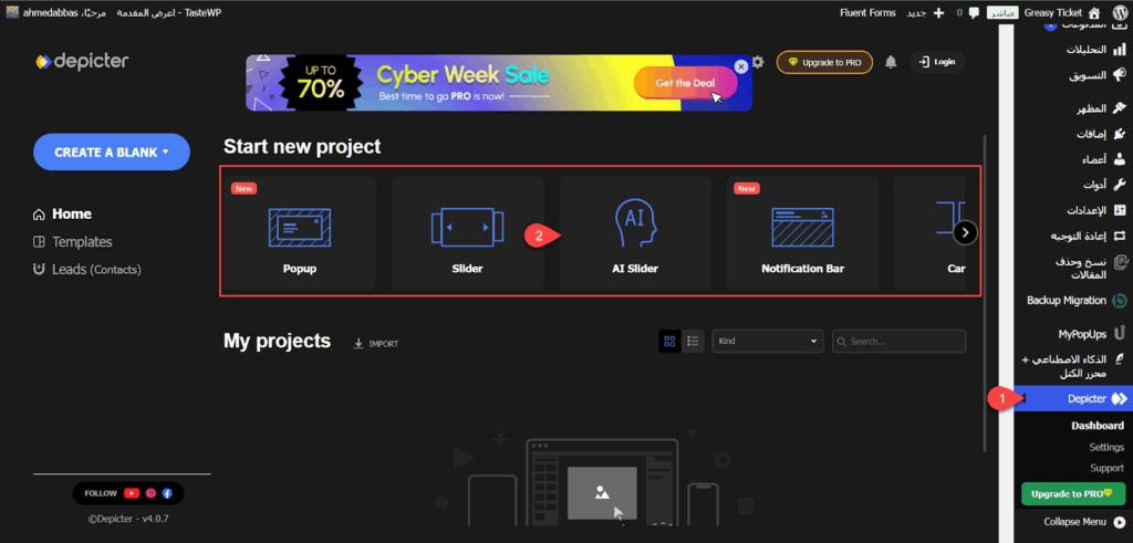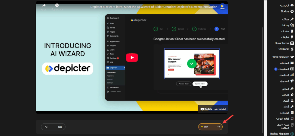 توفر إضافة Depicter إمكانية إنشاء أدوات متعددة، مثل النوافذ المنبثقة، والسلايد المتحرك، وشريط الاشعارات، والكاروسيل وغيرها. كما تتكامل مع ووكومرس للمتاجر الإلكترونية، لتسهّل عرض المنتجات والتفاعل معها. وخلال الخطوات القادمة، سأشارك تجربتي مع إضافة Depicter في إنشاء سلايد احترافي لمتجري.