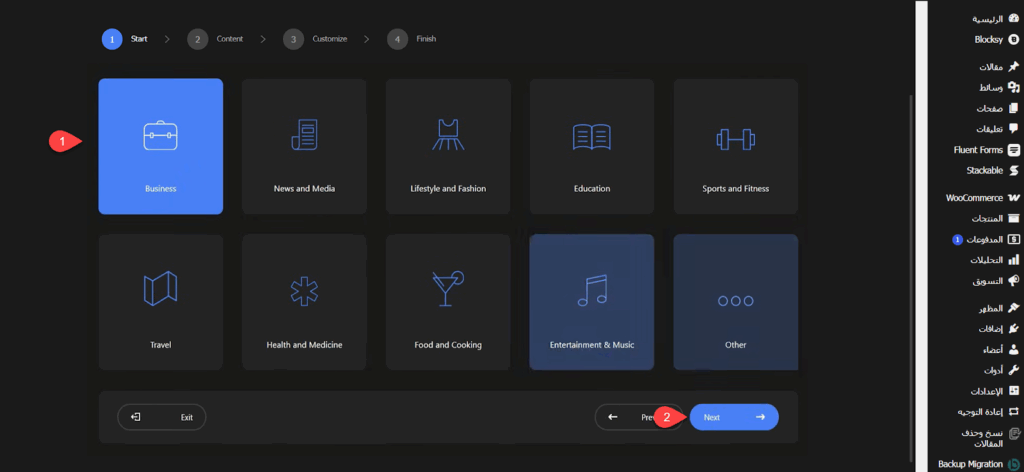 في الخطوة الأولى، حدد تخصص موقعك من بين الخيارات المتاحة، أو اختر Other واكتب تخصص موقعك يدويًا إذا لم يكن ضمن الخيارات الجاهزة، ثم اضغط على Next للانتقال إلى الخطوة التالية.