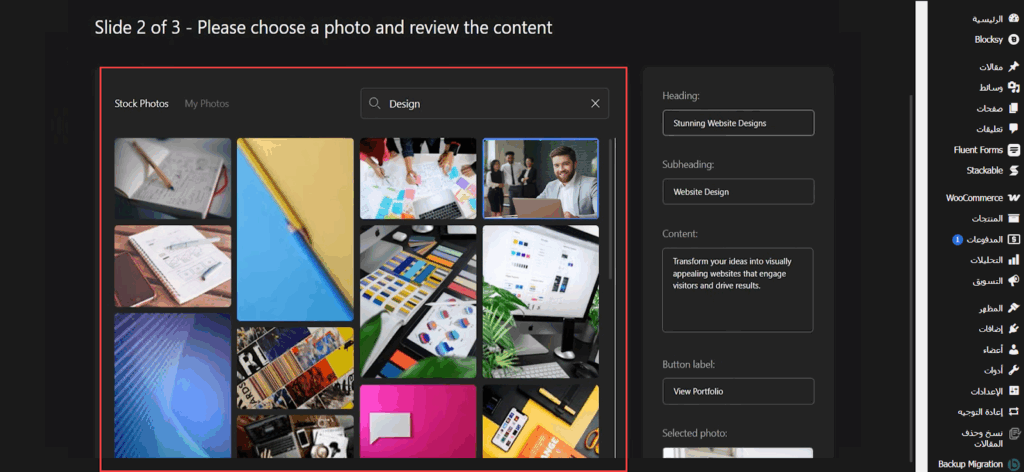 اختر الصور المناسبة لك بناءً على عدد السلايدات التي حددتها في المرحلة السابقة، ثم اضغط على Next للانتقال إلى الخطوة التالية.