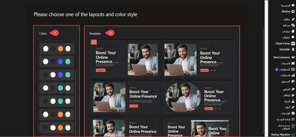 أخيرًا، حدد الألوان المناسبة لهوية موقعك من خيار Colors، ليعرض لك بعدها مجموعة من النماذج الجاهزة المعتمدة على الذكاء الاصطناعي. استعرض جميع النماذج، ثم اختر النموذج الأنسب لموقعك، كما هو موضح في الصورة التالية: