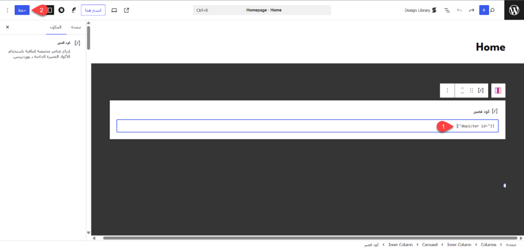 بعدها، أدرجت الكود المختصر الخاص بالسلايد بار الذي حصلت عليه من الخطوة السابقة، ثم حفظت التعديلات على الصفحة الرئيسية.