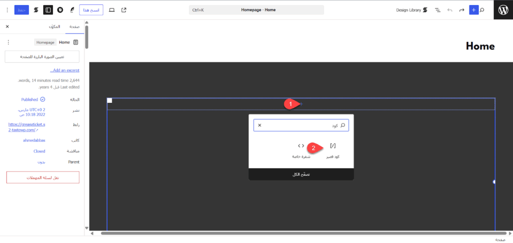 بعد النشر، انسخ كود السلايد بار من تبويب Shortcode، ثم أضف الكود في مكان العرض المناسب على الموقع، سواء في الصفحة الرئيسية أو أي صفحة داخلية أخرى.