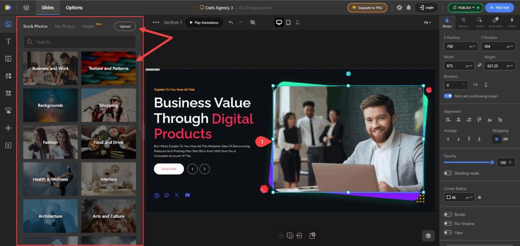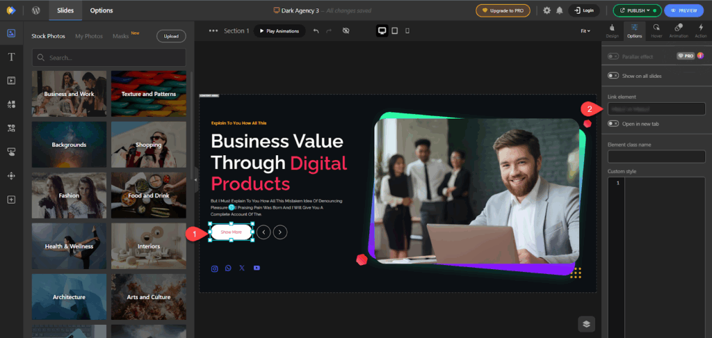 بعد اختيار طريقة العرض المناسبة والهوية البصرية، يتم توجيهك إلى لوحة التحكم الخاصة بالسلايد، والتي تتيح تخصيص السلايد يدويًا من حيث الخلفية، والصور، والأيقونات، والألوان، والنصوص، والخطوط، والأزرار، والأنيميشن، وغيرها من الإعدادات.