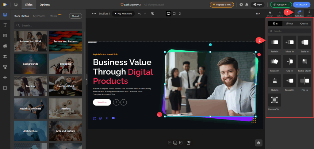 أخيرًا، خُصصت الأنيميشن بسهولة عبر الانتقال إلى تبويب Animation من الشريط العلوي، مع اختيار طريقة الحركة المناسبة.