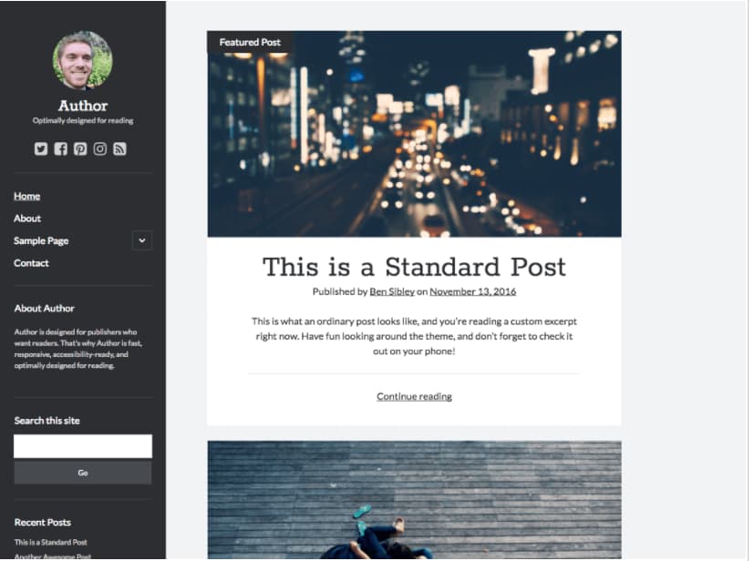 - قالب Author: يعتبر قالب مؤلف من أفضل القوالب للمدونين، إذ أنه يتميز بتصميم مؤلفٍ من عمودين، فتجد الشريط الجانبي وقائمة على أحد الجوانب، وتجد المحتوى على الجانب الآخر. يتوفر للقالب نسخة مجانية يمكن استخدامها عند إنشاء مدونة ووردبريس، ويمكن أيضًا شراء النسخة المدفوعة للحصول على مميزات إضافية.