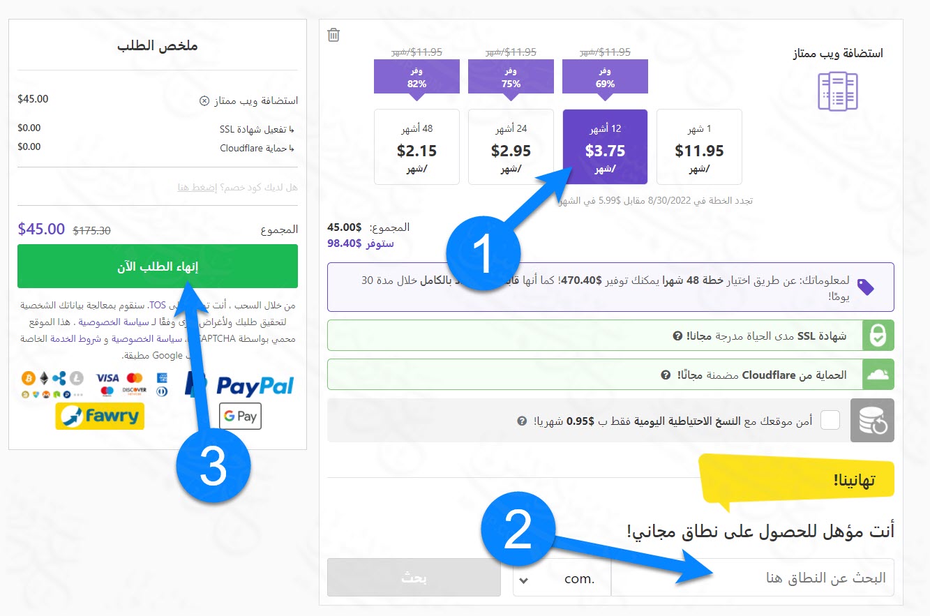 1. اختر مدة خطة الاستضافة، وكلما كانت الخطة أكبر كلما كانت أرخص. على سبيل المثال 12 شهر بسعر 45$، أما 3 سنوات (48 شهر) فبسعر 103$، وهذا توفير أكبر. كما توضح الصورة أعلاه (الخطوة رقم 1) أخترنا الحجز لمدة 12 شهر.