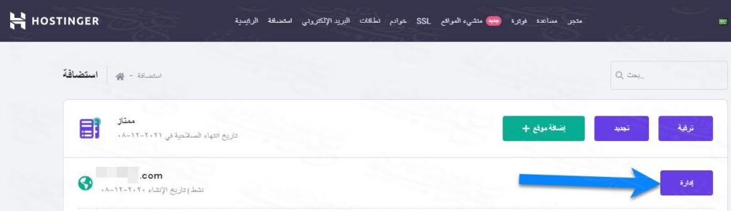 من القائمة الرئيسية menu أنقر على استضافة، وستجد الدومين الذي حجزته من قبل متوفر أمامك وبجانبه كلمة إدارة، فقم بالنقر على كلمة إدارة. وفي حالة أنك لم تجد الدومين، فقط عليك أن تضغط على إضافة موقع لإضافة الدومين الجديد، ثم أعد الذهاب إلى استضافة لتجد الدومين موجود لديك. المهم الآن أن تضغط على كلمة إدارة.