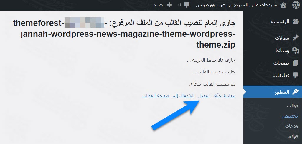جربت كما ترى رفع قالب جنة الذي اشتريته من themeforst، وبمجرد أن تم رفع القالب للموقع تم تنصيبه بالفعل، ويتبقى أمامي خطوة تفعيل القالب والتي تتم بمجرد الضغط على كلمة تفعيل المشار لها في الصورة أعلاه.