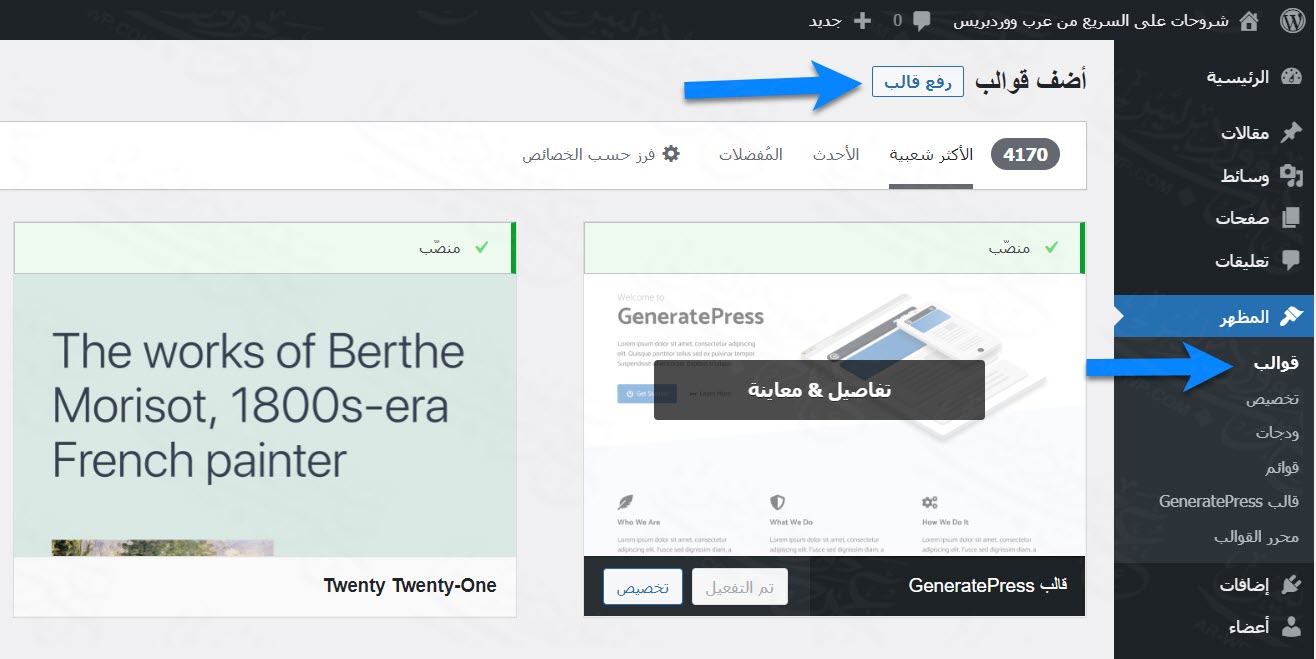 بعد اختيار قالب ووردبريس مناسب ويدعم اللغة العربية، يمكنك تركيب القالب على موقعك بالشكل التالي: