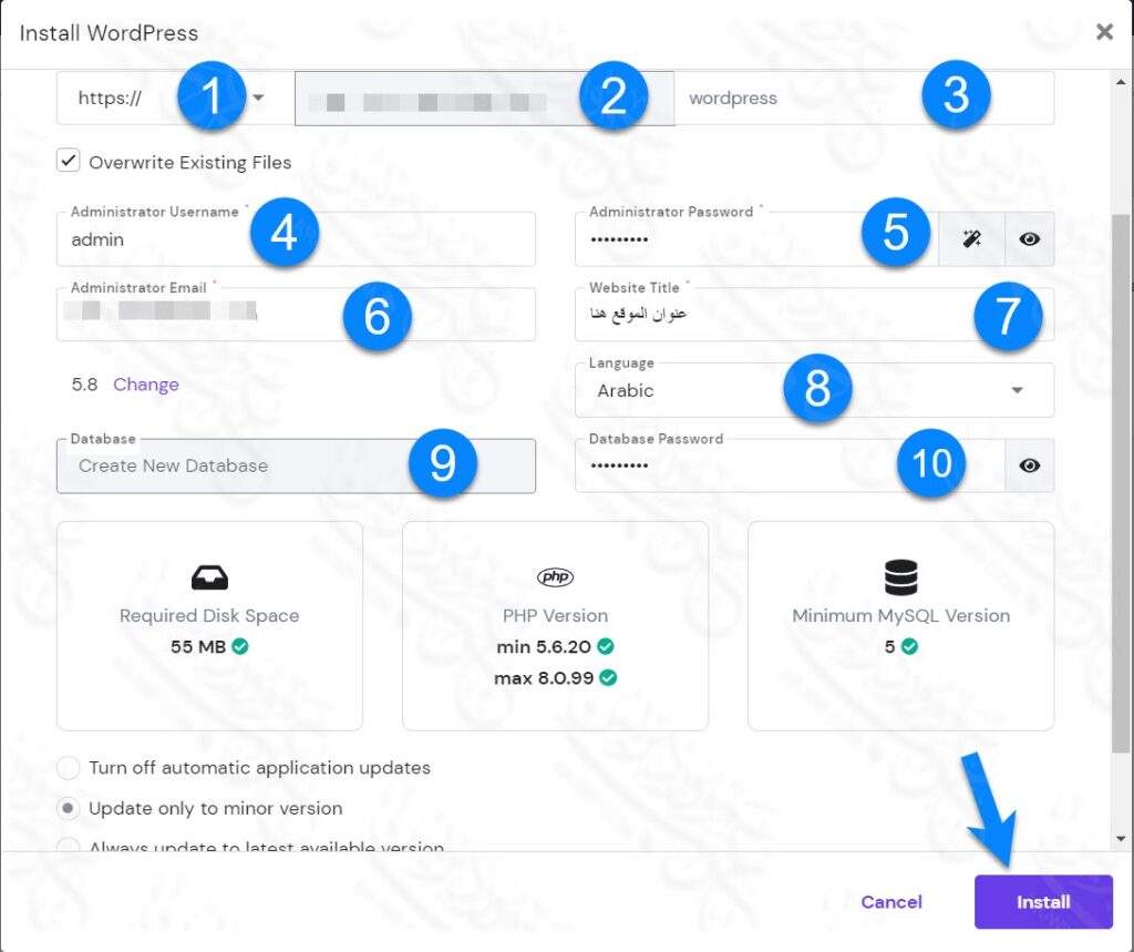 بمجرد أن تنتهي من كتابة التفاصيل الخاصة بك، أضغط على Install أو تثبيت، وانتظر قليلًا حتى يتم تثبيت الموقع الجديد.