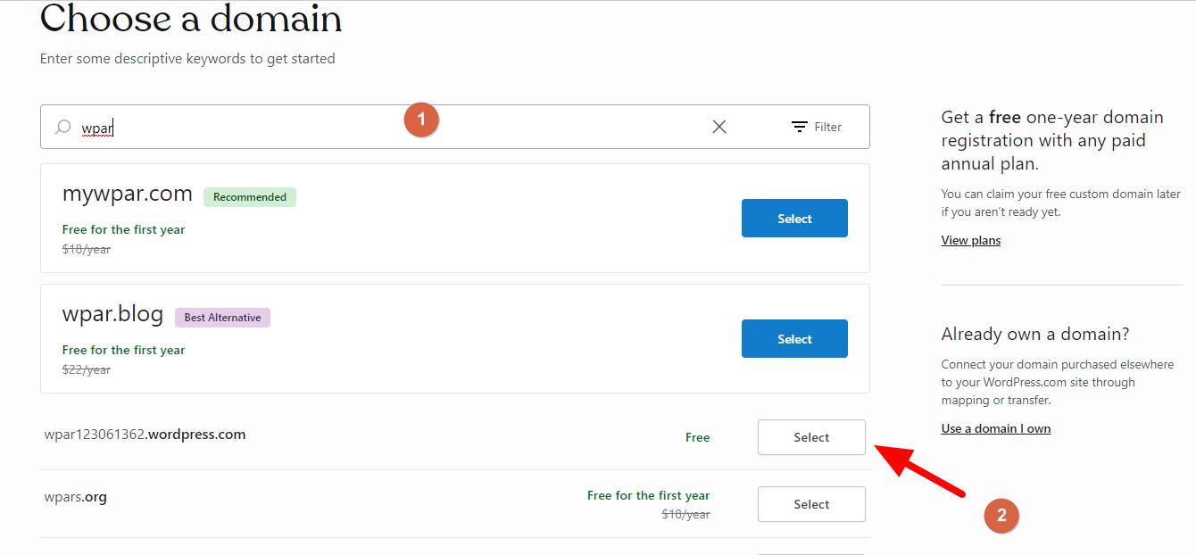 ادخل الدومين الذي تريده لموقع الووردبريس المجاني، وذلك بكتابة اسم الموقع أو العلامة التجارية الخاصة بك ومن ثم سيتم إظهار مجموعة من الخيارات لتختار الملائم منها، وبالتأكيد سيكون الدومين المنتهي بعبارة WordPress.com هو المقصود كما يظهر في الصورة بالأسفل. ولتحديده ما عليك إلا النقر على Select.