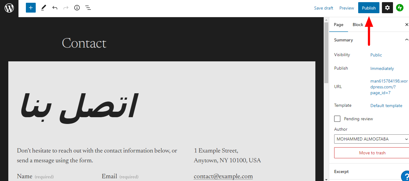 في النافذة التالية سيتم توجيهك إلى المحرر للتمكّن من تحرير الصفحة بالكامل من النصوص والألوان وغيرها، ومن بعد الإنتهاء انقر على Publish في الأعلى.