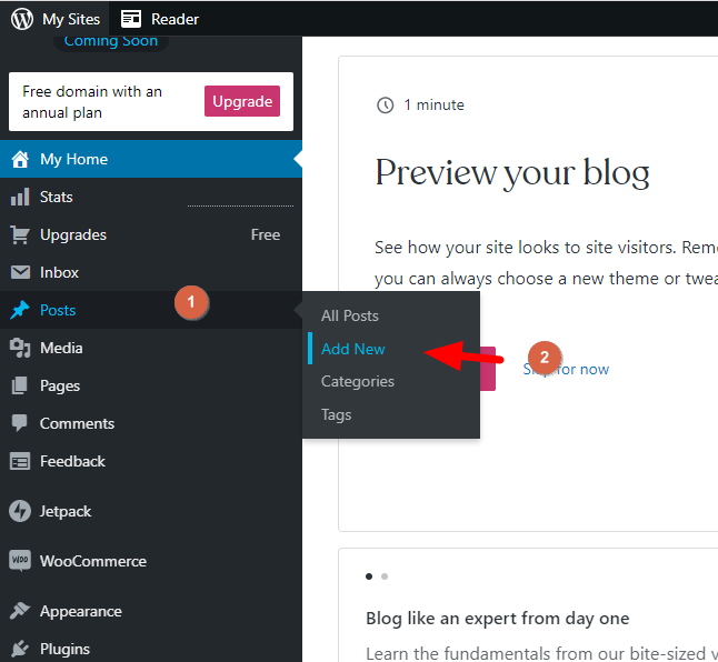في حال كُنت تريد إضافة مقال إلى موقع الووردبريس المجاني، فبإمكانك ذلك وبخطوات شبيهة بالتي تعرفنا عليها سابقًا عند إنشاء صفحة جديدة. انقر على خيار Posts ثم Add new.