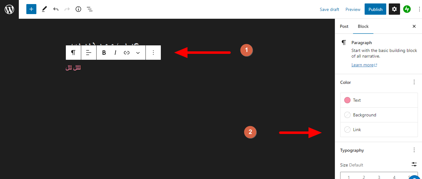 وبالنسبة لتنسيق النص فبإمكانك ذلك من خلال القائمة التي تظهر بجانب النص في الجزء العلوي محتوى على مجموعة من الخيارات من اتجاه الكتابة وتضخيم النص والربط بعناوين URL وفي نفس الوقت القائمة الموجودة في الزاوية السفلية اليُمنى والتي تتيح لك التحكم في لون النص والخلفية وأيضًا الحجم.