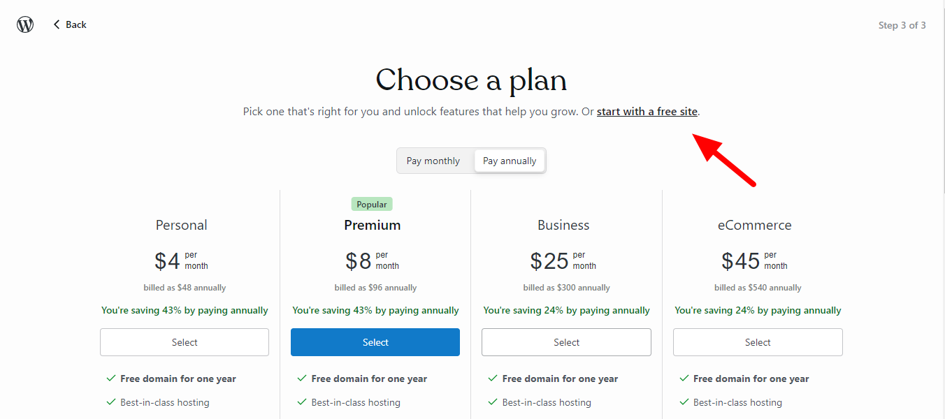 في النافذة التالية سيتم عرض مجموعة من الباقات المدفوعة، ولأنك تريد إنشاء موقع ووردبريس مجاني ففي هذه الحالة سيتوجب عليك النقر على خيار start with a free site.