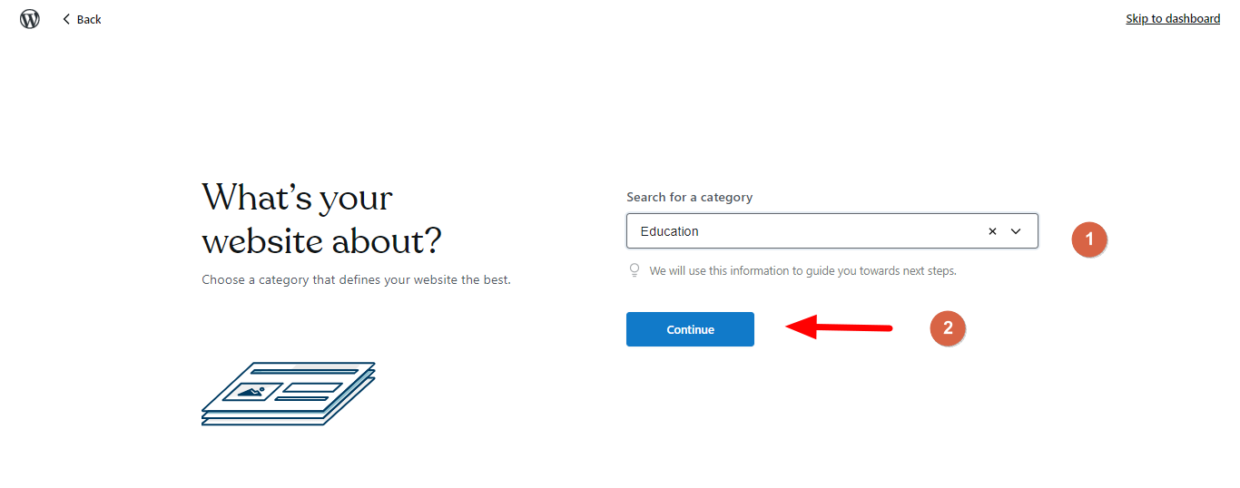 في الخطوة الأخيرة سيُطلب منك تنفيذ بعض الخطوات من نشر مقالك الأول والتعرف على الطريقة الصحيحة لنشر المقالات وأيضًا تخصيص الموقع، ولك كافة هذه الخطوات من الممكّن الشروع فيها لأحقًا ما عليك إلا النقر على خيار Skip to dashboard في الزاوية العلوية اليُمنى.