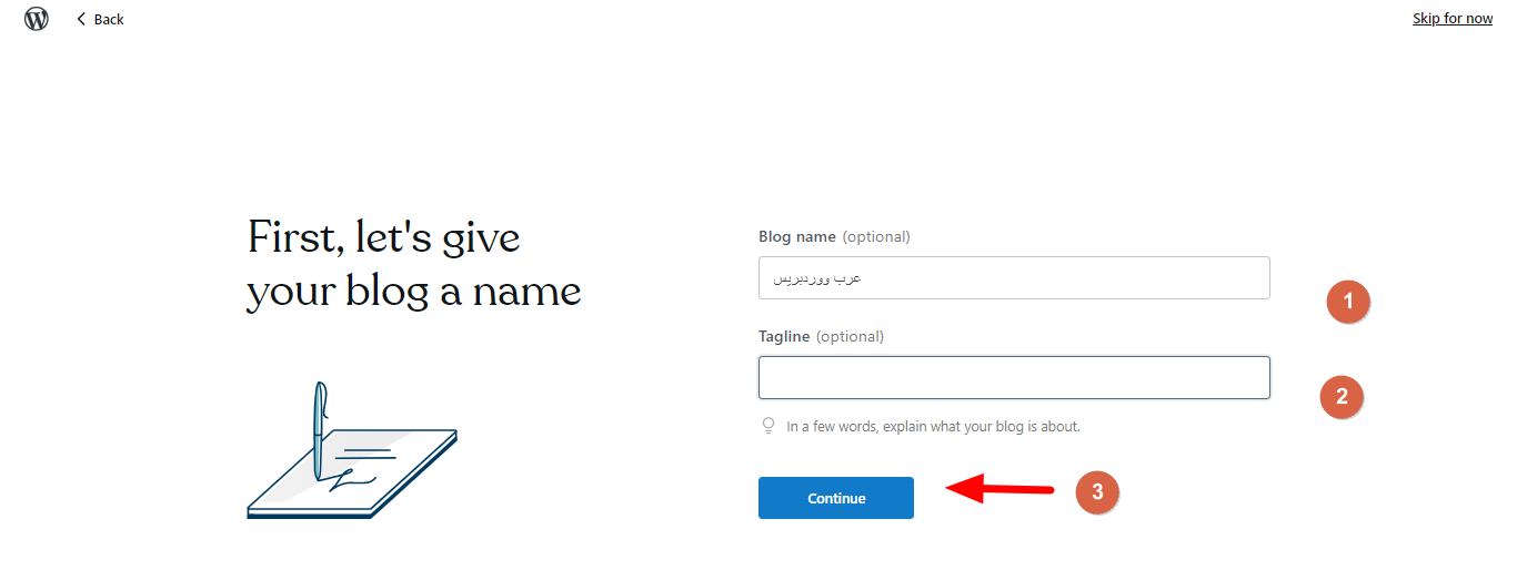 في النافذة التالية سيتوجب عليك إدخال اسم الموقع أو المدونة الخاصة بك، مع وصف قصير يصف ما يقدمه الموقع، وانقر على Continue.