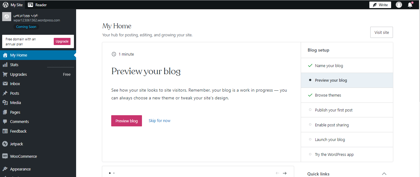 بعد ذلك، تكون قد تمكن من إنشاء موقع ووردبريس مجاني وبإمكانك استخدامه وبكل سهولة لنشر المحتوى وعرض المنتجات والخدمات الخاص بك.