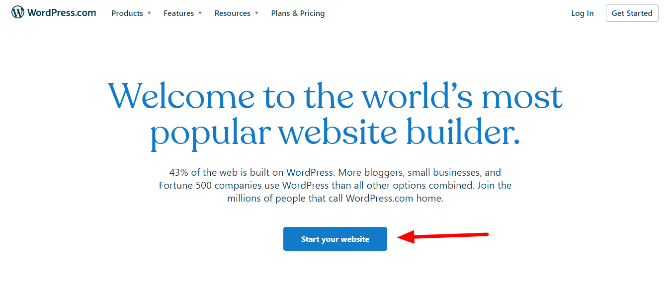 في البداية سيتوجب عليك التوجه إلى WordPress.com. ، ثم انقر على خيار Start your website.