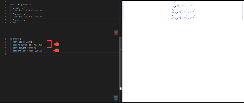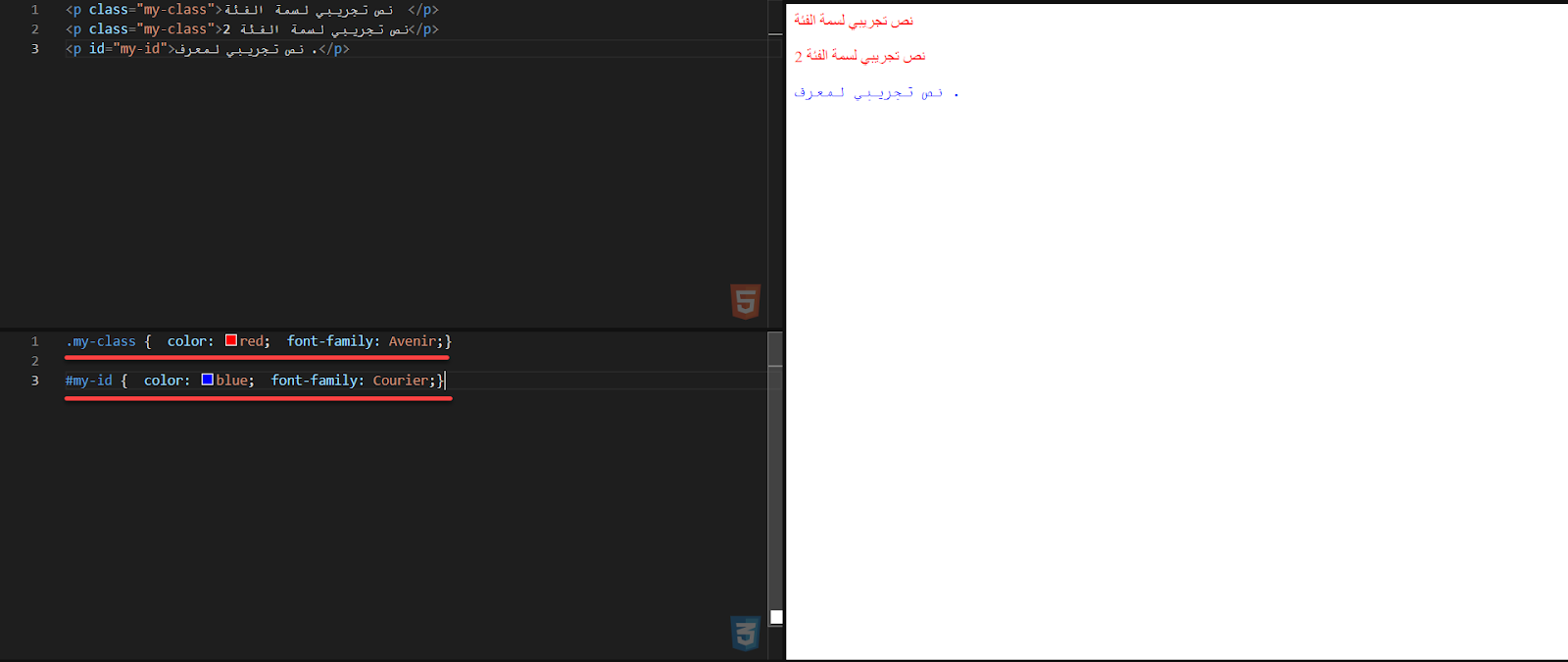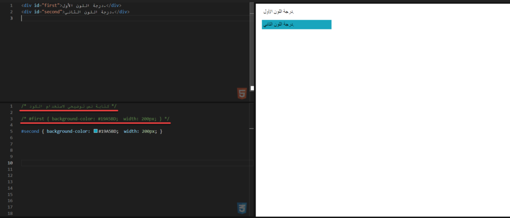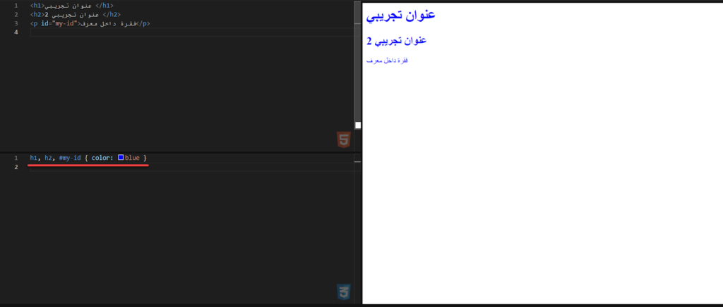 ويمكنك تحديد أكثر من معرف على نفس كود CSS، وذلك عن طريق الفصل بينهم باستخدام الفاصلة ","، على سبيل المثال استهداف فقرة داخل قسم بالإضافة إلى معرف كما موضح في الصورة التالية: