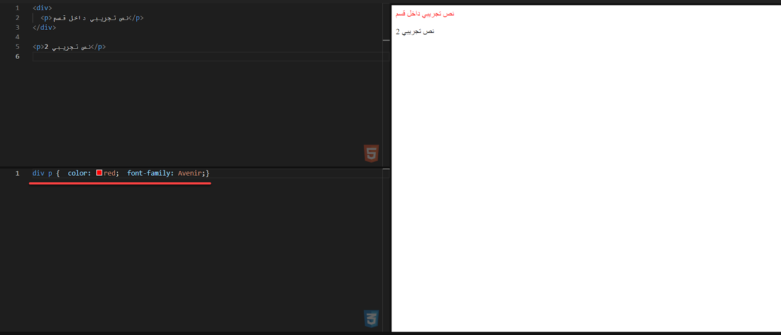 كما يمكنك استهداف عنصر فرعي داخل قسم، وذلك عن طريق تحديد القسم div، ثم تحديد العنصر المطلوب على سبيل المثال فقرة <p>، أو عنوان <h1>، وذلك كما موضح في الصورة التالية: