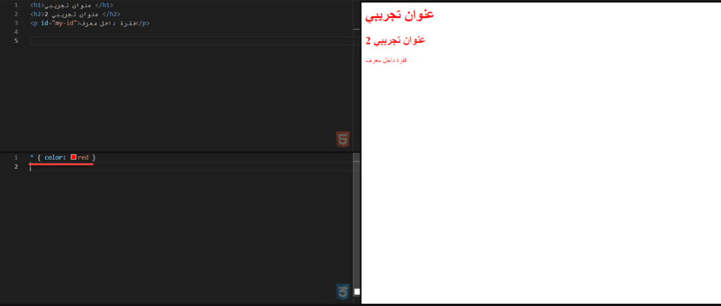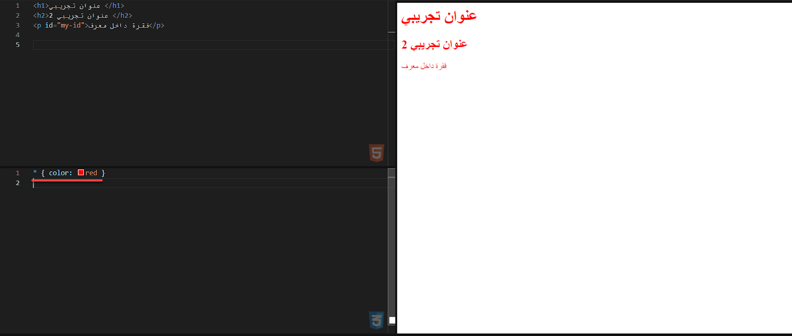 أما في حالة الرغبة في تحديد كافة العناصر في صفحة الويب، يتم كتابة رمز نجمة "*" في بداية كود CSS، وذلك كما موضح في الصورة التالية:
