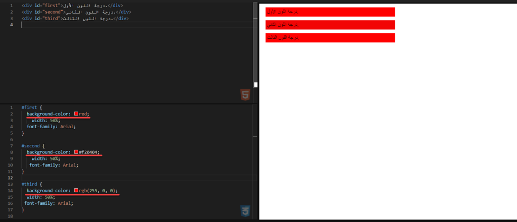 ويمكن أن تكون القيمة Value كلمات مباشرة على سبيل المثال Red أو Blue، ويمكن أن تكون متغيرات رقمية على سبيل المثال أيضًا #f20404، ويمكن أن تكون متغيرات ثابتة على سبيل المثال rgb(255, 0, 0)، وكافة الأمثلة السابقة تعبر عن نفس درجة اللون الأحمر، وذلك كما موضح في الصورة التالية: