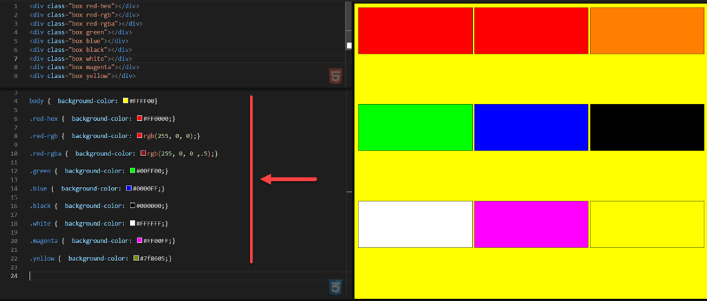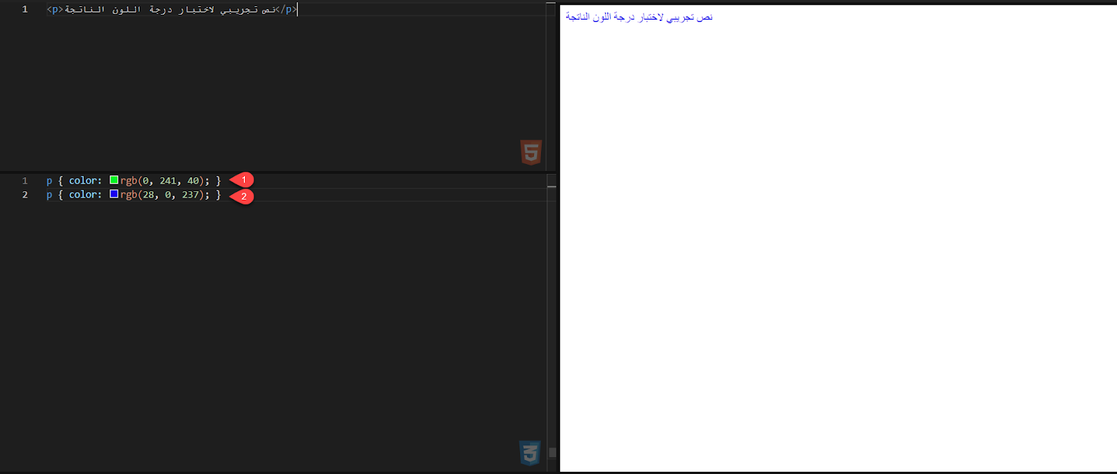 - تحديد درجة الألوان RGB عن طريق تحديد نسبة اللون الأحمر والأخضر والأزرق على سبيل المثال rgb(255, 87, 51)، ويمكن الاعتماد على قيم RGBA حيث يتم إضافة رقم عاشر مفصول يعبر عن درجة الشفافية، 1 يدل على شفافية 100 % و0 يدل على شفافية 0 %.