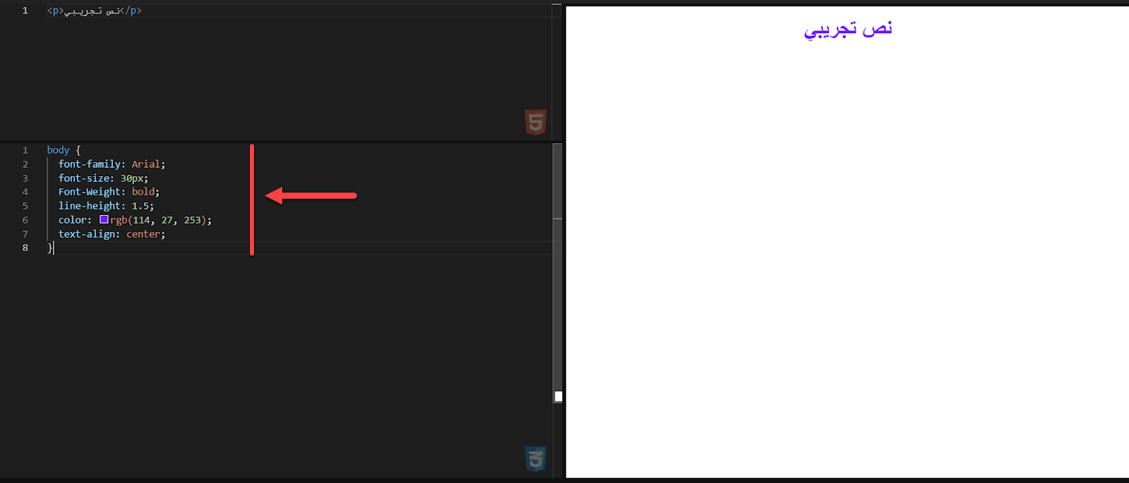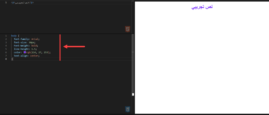على سبيل المثال لتحديد خصائص خط صفحة ويب بعائلة Arial، وحجم الخط 30px، وسمك الخط Bold، وارتفاع الخط 1.5px، ومحاذاة الكتابة في المنتصف، يتم كتابة كود CSS التالي: